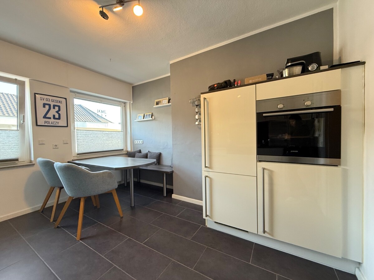 Der Grundriss ist funktional und bietet helle Räume durch zahlreiche Fenster. Highlights sind die moderne, hochglanz-cremefarbene Einbauküche mit integrierten Geräten, die einen Essbereich mit Eckbank und Tisch beinhaltet.